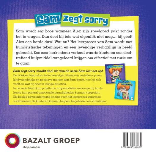 Sam zegt sorry Wanneer Sam zijn broertje Alex een harde duw geeft, weet hij heel goed dat hij iets verkeerd heeft gedaan. Toch vindt hij het moeilijk om sorry te zeggen - vooral omdat hij vindt dat Alex de duw eigenlijk verdiend heeft! Zoals ieder kind probeert Sam het probleem te negeren en wil hij niet nadenken over wat hij gedaan heeft. Zijn moeder leert hem in vier stappen hoe hij met de ruzie kan omgaan en hoe hij het weer goed kan maken: 1) wat heb ik gedaan? 2) hoe voelde de ander zich? 3) wat kan ik de volgende keer doen? 4) hoe ga ik het goedmaken? Sam maakt een sorry-strip om alle stappen goed te kunnen onthouden. Lukt het Sam om sorry te zeggen tegen zijn broertje en weer gezellig samen te gaan spelen? Een zeer herkenbaar verhaal waarin kinderen een doeltreffend hulpmiddel aangeleerd krijgen om effectief met ruzie om te gaan. ISBN: 978-94-6118-186-2