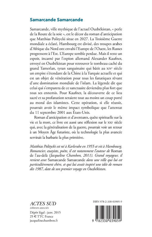 Samarcande, ville mythique de l'actuel Ouzbékistan, « perle de la Route de la soie », est le décor du roman d'anticipation que Matthias Politycki situe en 2027. La Troisième Guerre mondiale a éclaté, Hambourg est divisé, des troupes arabes d'Afrique du Nord ont envahi l'Europe de l'Ouest, les Russes progressent à l'Est. L'Europe semble perdue. Mais il reste un espoir, incarné par l'espion allemand Alexander Kaufner, envoyé en Ouzbékistan pour retrouver le tombeau caché du grand Tamerlan, tyran sanguinaire qui bâtit au xive siècle un empire s'étendant de la Chine à la Turquie actuelle et qui est un objet de vénération pour tous les fanatiques rêvant d'une domination mondiale de l'islam. La légende dit que celui qui s'emparera de ce sanctuaire deviendra plus fort que tous ses ennemis. Pour Kaufner, la découverte de ce lieu sacré et sa profanation seraient tout au moins un coup porté au moral des islamistes. Cette opération, si elle réussit, pourrait avoir le même impact symbolique que l'attentat du 11 septembre 2001 aux États-Unis.