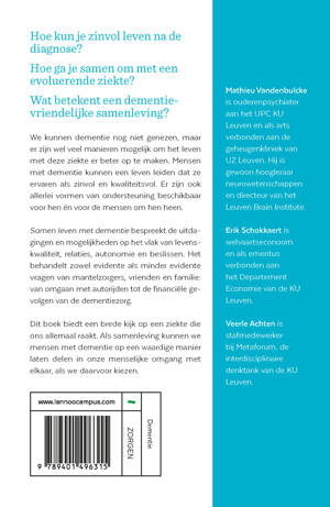 Samen leven met dementie bespreekt de uitdagingen en mogelijkheden op het vlak van levenskwaliteit, relaties, autonomie en beslissen. Het behandelt zowel evidente als minder evidente vragen van mantelzorgers, vrienden en familie: van omgaan met autorijden tot de financiële gevolgen van de dementiezorg.