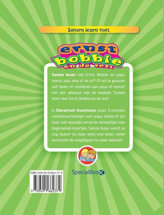 Samen lezen met Ernst, Bobbie èn papa, mama, opa, oma of de juf? Of wil je gewoon zelf lezen of voorlezen aan papa of mama? Het kan allemaal met de boekjes 'Samen lezen met Ernst, Bobbie en de rest'. In Dierentuin Avonturen staan 3 minuten voorleesverhaaltjes voor papa, mama of juf, maar ook woordjes en korte verhaaltjes voor beginnende lezertjes. Samen lezen wordt zo nog leuker! Ga maar eens snel lezen welke avonturen de soepkippen nu weer beleven!