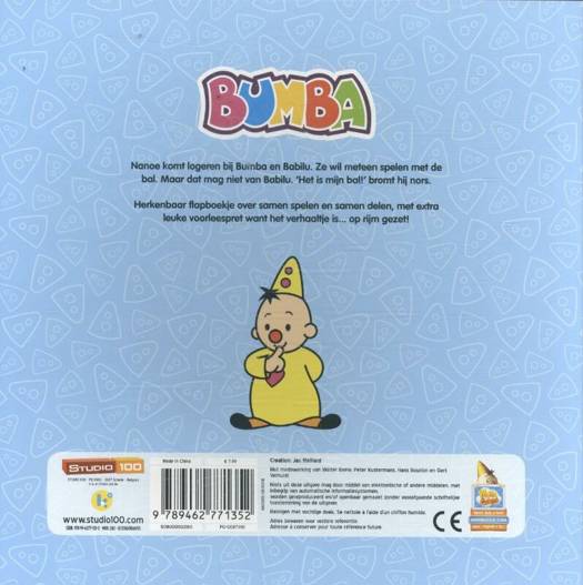 Nanoe komt logeren bij Bumba en Babilu. Ze wil meteen spelen met de bal. Maar dat mag niet van Babilu. 'Het is mijn bal!' bromt hij nors. Herkenbaar flapboekje over samen spelen en samen delen, met extra leuke voorleespret want het verhaaltje is... op rijm gezet!