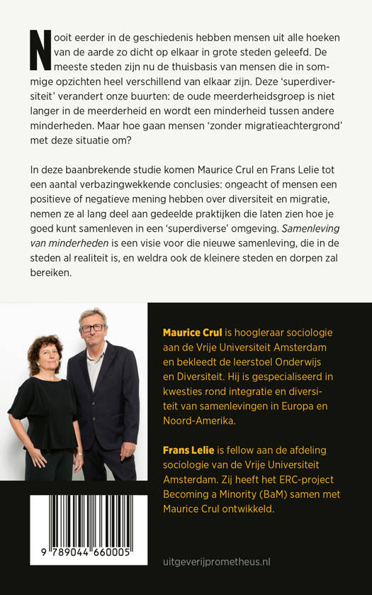 Nooit eerder in de geschiedenis hebben mensen uit alle hoeken van de aarde zo dicht op elkaar in grote steden geleefd. De meeste steden zijn nu de thuisbasis van mensen die in sommige opzichten heel verschillend van elkaar zijn. Deze ‘superdiversiteit’ verandert onze buurten: de oude meerderheidsgroep is niet langer in de meerderheid en wordt een minderheid tussen andere minderheden. Maar hoe gaan mensen ‘zonder migratieachtergrond’ met deze situatie om? In deze baanbrekende studie komen Maurice Crul en Frans Lelie tot een aantal verbazingwekkende conclusies: ongeacht of mensen een positieve of negatieve mening hebben over diversiteit en migratie, nemen ze allang deel aan gedeelde praktijken die laten zien hoe je goed kunt samenleven in een ‘superdiverse’ omgeving. Een samenleving van minderheden is een visie voor die nieuwe samenleving, die in de steden al realiteit is, en weldra ook de kleinere steden en dorpen zal bereiken.