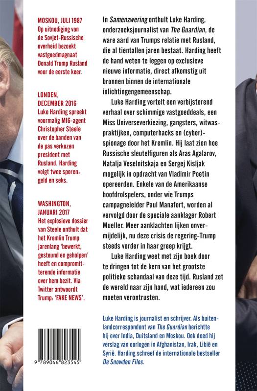 In Samenzwering onthult Luke Harding, onderzoeksjournalist van The Guardian, de ware aard van Trumps relatie met Rusland, die al sinds de jaren 80 bestaat. Harding heeft de hand weten te leggen op exclusieve nieuwe informatie, direct afkomstig uit bronnen binnen de internationale inlichtingengemeenschap. Luke Harding vertelt een verbijsterend verhaal over schimmige vastgoeddeals, een Miss Universeverkiezing, gangsters, witwaspraktijken, computerhacks en (cyber)spionage door het Kremlin. Hij laat zien hoe machtige Russen als Aras Agalarov, Natalia Veselnitskaja en Sergej Kisljak mogelijk in opdracht van Vladimir Poetin opereerden. Enkele van de Amerikaanse hoofdrolspelers, onder wie Trumps campagneleider Paul Manafort, worden al vervolgd door de speciale aanklager Robert Mueller. Meer aanklachten lijken onvermijdelijk, nu deze crisis de regering Trump steeds verder in zijn greep krijgt. Luke Harding weet met zijn boek door te dringen tot de kern van het grootste politieke schandaal van deze tijd. Rusland reorganiseert de wereld in zijn voordeel, wat iedereen zou moeten verontrusten.