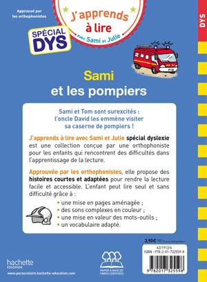 Sami et Tom sont surexcités : l’oncle David les emmène visiter sa caserne de pompiers ! « J’apprends à lire avec Sami et Julie spécial dyslexie » est une collection conçue pour les enfants qui rencontrent des difficultés dans l’apprentissage de la lecture. Approuvée par les orthophonistes, elle propose des histoires courtes et adaptées pour rendre la lecture facile et accessible. L’enfant peut lire seul et sans difficulté grâce à : • une mise en pages aménagée ; • des sons complexes en couleur ; • une mise en valeur des mots-outils ; • un vocabulaire adapté.