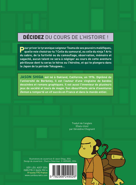 Pour priver le tyrannique seigneur Touma de ses pouvoirs maléfiques, quelle voie choisiras-tu ? Celle du samouraï, ou celle du ninja ? Arts du sabre, de la furtivité ou du camouflage, observation, mémoire et sagacité, aucun talent ne sera à négliger au cours de cette aventure périlleuse dont tu seras le héros ou l'héroïne, et qui te plongera dans le Japon de la période Tokugawa...