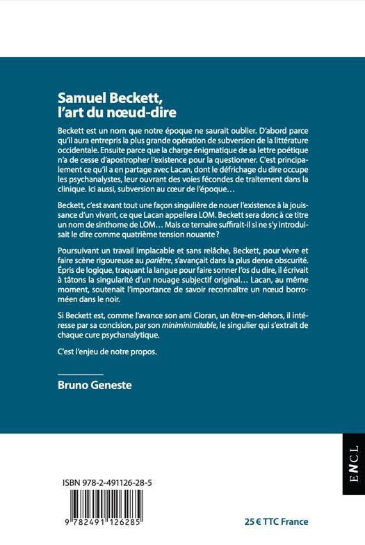 Beckett est un nom que notre époque ne saurait oublier. D’abord parce qu’il aura entrepris la plus grande opération de subversion de la littérature occidentale. Ensuite parce que la charge énigmatique de sa lettre poétique n’a de cesse d’apostropher l’existence. C’est principalement ce qu’il a en partage avec Lacan, dont le défrichage du dire occupe les psychanalystes, leur ouvrant des voies fécondes dans la clinique. Ici aussi, subversion au coeur de l’époque...<br /> Beckett, c’est avant tout une façon singulière de nouer l’existence à la jouissance d’un vivant, ce que Lacan appellera LOM. Beckett sera donc à ce titre un nom de sinthome de LOM... Mais ce ternaire suffirait-il si ne s’y introduisait le dire comme quatrième tension nouante ?<br /> Poursuivant un travail implacable et sans relâche, Beckett, pour vivre et faire scène rigoureuse au parlêtre, s’avançait dans la plus dense obscurité. Épris de logique, traquant la langue pour faire sonner l’os du dire, il écrivait à tâtons la singularité d’un nouage subjectif original... Lacan, au même moment, soutenait l’importance de savoir reconnaître un noeud borroméen dans le noir.<br /> Si Beckett est, comme l’avance son ami Cioran, un être-en-dehors, il intéresse par sa concision, par son miniminimitable, le singulier qui s’extrait de chaque cure psychanalytique. C’est l’enjeu de notre propos.<br />