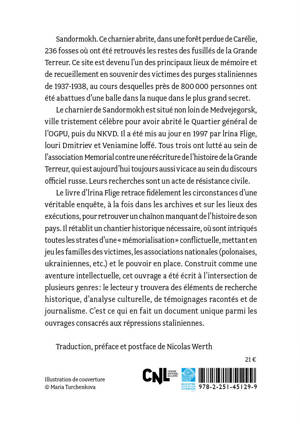 Sandormokh. Ce charnier abrite, dans une foret perdue de Carelie, 236 fosses ou ont ete retrouves les restes des fusilles de la Grande Terreur. Ce site est devenu l'un des principaux lieux de memoire et de recueillement en souvenir des victimes des purges staliniennes de 1937-1938, au cours desquelles pres de 800 000 personnes ont ete abattues d'une balle dans la nuque dans le plus grand secret. Le charnier de Sandormokh est situe non loin de Medvejegorsk, ville tristement celebre pour avoir abrite le Quartier general de l'OGPU, puis du NKVD. Il a ete mis au jour en 1997 par lrina Flige, louri Dmitriev et Veniamine loffe. Tous trois ont lutte au sein de l'association Memorial contre une reecriture de l'histoire de la Grande Terreur, qui est aujourd'hui toujours aussi vicace au sein du discours officiel russe. Leurs recherches sont un acte de resistance civile. Le livre d'lrina Flige retrace fidelement les circonstances d'une veritable enquete, a la fois dans les archives et sur les lieux des executions, pour retrouver un chainon manquant de l'histoire de son pays. Il retablit un chantier historique necessaire, ou sont intriques toutes les strates d'une memorialisation conflictuelle, mettant en jeu les familles des victimes, les associations nationales (polonaises, ukrainiennes, etc.) et le pouvoir en place. Construit comme une aventure intellectuelle, cet ouvrage a ete ecrit a l'intersection de plusieurs genres: le lecteur y trouvera des elements de recherche historique, d'analyse culturelle, de temoignages racontes et de journalisme. C'est ce qui en fait un document unique parmi les ouvrages consacres aux repressions staliniennes.