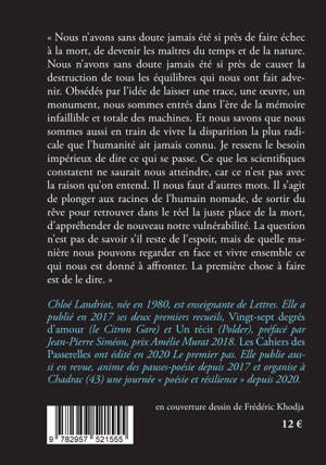 Voici le grand poème de sensibilité écologiste que nous attendions. Une jeune poète entend dire ce qu'il se passe. Comment la volonté humaine de laisser des traces, des