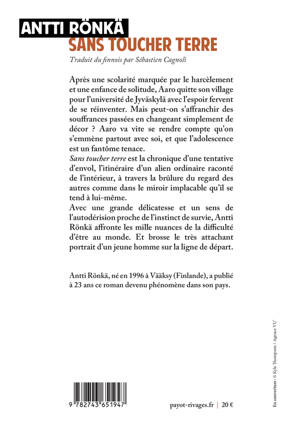 Marqué par le harcèlement scolaire qu'il a subi toute son enfance, le jeune Aaro, qui ne trouve sa place ni à l'école ni dans sa propre famille, envisage son entrée à l'université comme une possible réinvention de lui-même. Très vite, il comprend que le changement de décor ne fait rien à l'affaire : on s'emmène partout avec soi. Avec ce premier roman phénomène dans son pays, itinéraire d'un alien ordinaire terriblement attachant, non dépourvu d'humour et d'autodérision, le jeune Antti Rönkä révèle une voix singulière et irrésistible. Comme une version finlandaise du tube de Radiohead : «Creep. »