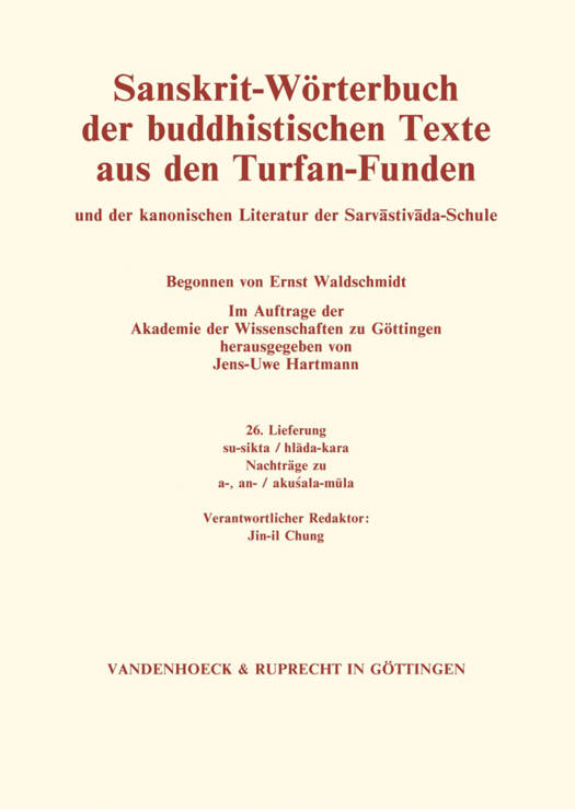 English summary: The Sanskrit Dictionary covers the canonical literature of the Sarvastivada School which has survived in the Turfan texts. The 26th installment comprises the 6th installment of Volume IV, which completes the alphabet. Subsequent fascicles are dedicated to the addenda. German description: Das Sanskrit-Worterbuch erschliesst die kanonische Literatur der Sarvastivada-Schule, wie sie in den Turfan-Texten uberliefert ist. Die 26. Lieferung bildet die sechste Lieferung des IV. Bandes. Damit ist das Alphabet abgeschlossen. Die folgenden Faszikel werden den Nachtragen gewidmet sein.