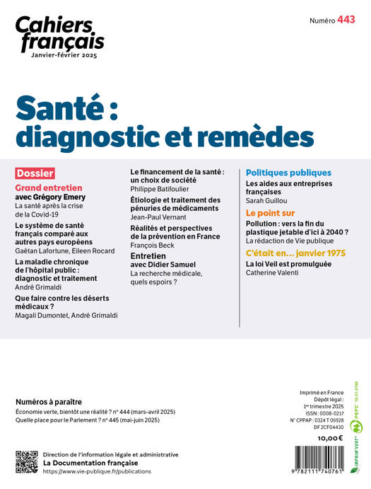 Le système de santé français, qui a longtemps fait figure d’exemple dans le monde, est aujourd’hui en souffrance. Médecins, infirmiers et aides-soignants ont fait preuve d’un engagement exemplaire durant la crise de Covid-19, mais la pandémie a été un révélateur de carences notables : manque de personnels soignants, capacités d’accueil insuffisantes, urgences saturées, offre de soins très insuffisante dans les territoires ruraux... L’enjeu de ce numéro de Cahiers français n’est ni de s’appesantir sur ces multiples difficultés ni de maquiller la réalité de la situation mais de présenter les enjeux clés de l’offre de soins et ses leviers d’amélioration tangibles.