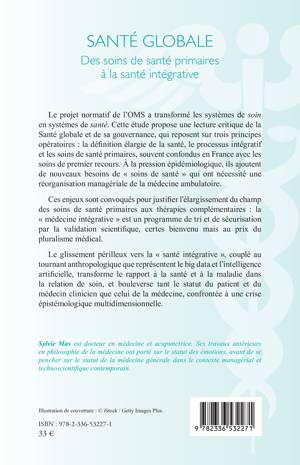 Le projet normatif de l'OMS a transformé les systèmes de soin en systèmes de santé. Cette étude propose une lecture critique de la Santé globale et de sa gouvernance, qui reposent sur trois principes opératoires: la définition élargie de la santé, le processus intégratif et les soins de santé primaires, souvent confondus en France avec les soins de premier recours. À la pression épidémiologique, ils ajoutent de nouveaux besoins de soins de santé qui ont nécessité une réorganisation managériale de la médecine ambulatoire. Ces enjeux sont convoqués pour justifier l'élargissement du champ des soins de santé primaires aux thérapies complémentaires: la médecine intégrative est un programme de tri et de sécurisation par la validation scientifique, certes bienvenu mais au prix du pluralisme médical. Le glissement périlleux vers la santé intégrative, couplé au tournant anthropologique que représentent le big data et l'intelligence artificielle, transforme le rapport à la santé et à la maladie dans la relation de soin et bouleverse tant le statut du patient et du médecin clinicien que celui de la médecine, confrontée à une crise épistémologique multidimensionnelle.