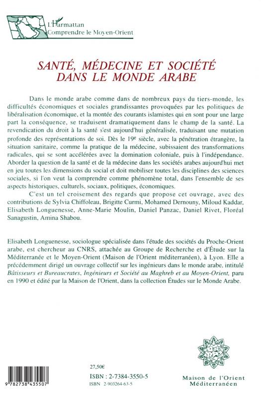 Dans le monde arabe comme dans de nombreux pays du tiers-monde, les difficultés économiques et sociales grandissantes provoquées par les politiques de libéralisation économique, et la montée des courants islamistes qui en sont pour une large part la conséquence, se traduisent dramatiquement dans le champ de la santé. La revendication du droit à la santé s'est aujourd'hui généralisée, traduisant une mutation profonde des représentations de soi. Dès le 19e siècle, avec la pénétration étrangère, la situation sanitaire, comme la pratique de la médecine, subissaient des transformations radicales, qui se sont accélérées avec la domination coloniale, puis à l'indépendance. Aborder la question de la santé et de la médecine dans les sociétés arabes aujourd'hui met en jeu toutes les dimensions du social et doit mobiliser toutes les disciplines des sciences sociales, si l'on veut la comprendre comme phénomène total, dans l'ensemble de ses aspects historiques, culturels, sociaux, politiques, économiques. C'est un tel croisement des regards que propose cet ouvrage, avec des contributions de Sylvia Chiffoleau, Brigitte Curmi, Mohamed Demouny, Miloud Kaddar, Elisabeth Longuenesse, Anne-Marie Moulin, Daniel Panzac, Daniel Rivet, Floréal Sanagustin, Amina Shabou. Elisabeth Longuenesse, sociologue spécialisée dans l'étude des sociétés du Proche-Orient arabe, est chercheur au CNRS, attachée au Groupe de Recherche et d'Étude sur la Méditerranée et le Moyen-Orient (Maison de l'Orient méditerranéen), à Lyon. Elle a précédemment dirigé un ouvrage collectif sur les ingénieurs dans le monde arabe, intitulé Bâtisseurs et Bureaucrates, Ingénieurs et Société au Maghreb et au Moyen-Orient, paru en 1990 et édité par la Maison de l'Orient, dans la collection Études sur le Monde Arabe.