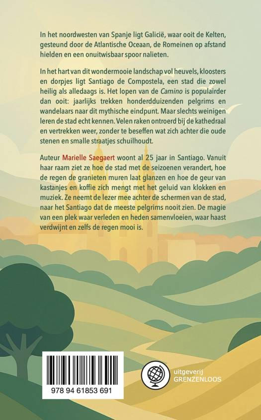 Auteur Marielle Saegert woont al 25 jaar in Santiago. Vanuit haar raam ziet ze hoe de stad met de seizoenen verandert, hoe de regen de granieten muren laat glanzen en hoe de geur van kastanjes en koffie zich mengt met het geluid van klokken en muziek. Ze neemt de lezer mee achter de schermen van de stad, naar het Santiago dat de meeste pelgrims nooit zien. De magie van een plek waar verleden en heden samenvloeien, waar haast verdwijnt en zelfs de regen mooi is.