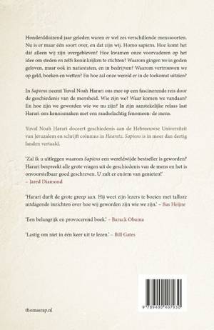 Honderdduizend jaar geleden waren er wel zes verschillende menssoorten. Nu is er maar één soort over, en dat zijn wij. Homo sapiens. Hoe komt het dat alleen wij zijn overgebleven? Hoe kwamen onze voorvaderen op het idee om steden en zelfs koninkrijken te stichten? Waarom gingen we in goden geloven, maar ook in natiestaten, en in bedrijven. Waarom vertrouwen we op geld, boeken en wetten? En hoe zal onze wereld er in de toekomst uitzien?