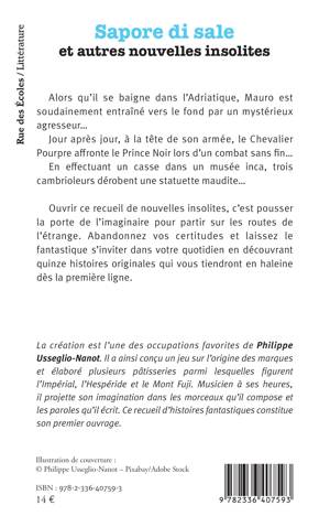 Alors qu’il se baigne dans l’Adriatique, Mauro est soudainement entraîné vers le fond par un mystérieux agresseur… Jour après jour, à la tête de son armée, le Chevalier Pourpre affronte le Prince Noir lors d’un combat sans fin… En effectuant un casse dans un musée inca, trois cambrioleurs dérobent une statuette maudite… Ouvrir ce recueil de nouvelles insolites, c’est pousser la porte de l’imaginaire pour partir sur les routes de l’étrange. Abandonnez vos certitudes et laissez le fantastique s’inviter dans votre quotidien en découvrant quinze histoires originales qui vous tiendront en haleine dès la première ligne.