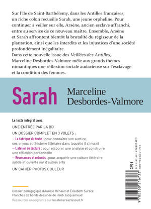 Sur l'île de Saint-Barthélemy, dans les Antilles françaises, un riche colon recueille Sarah, une jeune orpheline. Pour continuer à veiller sur elle, Arsène, ancien esclave affranchi, entre au service de ce nouveau maître. Ensemble, Arsène et Sarah affrontent bientôt la brutalité du régisseur de la plantation, ainsi que les interdits et les injustices d'une société profondément inégalitaire. Dans cette nouvelle issue des Veillées des Antilles, Marceline Desbordes-Valmore mêle aux grands thèmes romantiques une réflexion so ciale audacieuse sur l'esclavage et la condition des femmes. Le texte intégral avec : UNE ENTRÉE PAR LA BD UN DOSSIER COMPLET EN 3 VOLETS : - La fabrique du texte : présentation de l'autrice, de l'oeuvre et de l'histoire littéraire dans laquelle elle s'inscrit - L'atelier de lecture : études d'ensemble, explications de texte guidées et activités d'appropriation - Résonances et rebonds : groupements de textes et histoire des arts UN CAHIER PHOTOS COULEUR