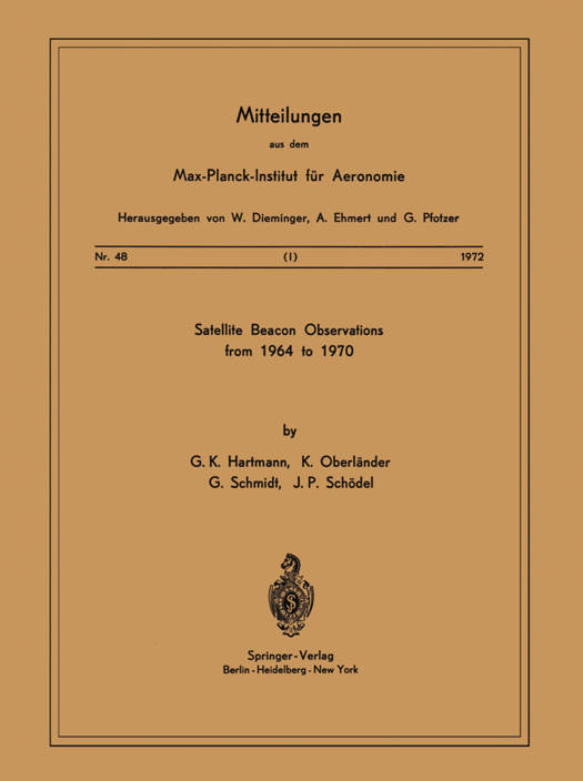 From October 1964 to May 1969 the 40 MHz, 41 MHz, and 360 MHz signals of the satellite Explo- 0 0 rer 22, were recorded at Lindau (51,650 N; 10,125 E). The Faraday effect recordings at 40 MHz and 41 MHz and Dispersive-Doppler-effect recordings at 40 MHz and 360 MHz were used to calculate the ionospheric electron content up to 1000 km. The mean electron content for 1 hour periods over a period 0 of three months as obtained at 51. 6 N geographic latitude as derived from various evaluation methods is presented. Furthermore, the relevant critical frequency FOF2 is displayed. A similar presentation was chosen for the calculated slabthickness data. For one specific case the daily variation of the electron con- tent as determined by measurements was compared with a relevant theoretical curve. The agreement, was fairly good. Due to technical problems the beacons were switched off in 1969. Now the five orbiting FS-NNSS satellites provide a good possibility to determine the ionospheric electron content up to 1100 km fairly accurately by evaluating the Dispersive Doppler recordings obtained at 150 MHz and 400 MHz. The amplitude recordings of the 40 MHz and 41 MHz signals of Explorer 22 were furthermore used for amplitude scintillation studies. Simultaneous Dispersive-Doppler-recordings enabled in part also pha- se scintillation studies. Phase and amplitude recordings were compared.