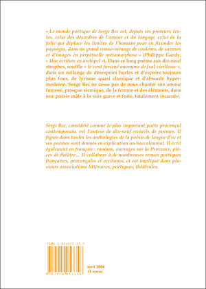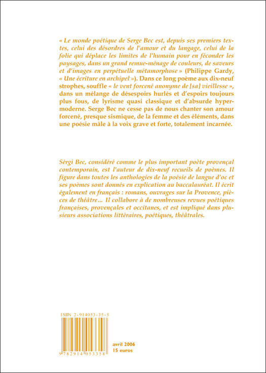 « Le monde poétique de Serge Bec est, depuis ses premiers textes, celui des désordres de l’amour et du langage, celui de la folie qui déplace les limites de l’humain pour en féconder les paysages, dans un grand remue-ménage de couleurs, de saveurs et d’images en perpétuelle métamorphose » (Philippe Gardy, « Une écriture en archipel ») Dans ce long poème aux dix-neuf strophes, souffle « le vent forcené anonyme de [sa] vieillesse », dans un mélange de désespoirs hurlés et d’espoirs toujours plus fous, de lyrisme quasi classique et d’absurde hyper-moderne. Serge Bec ne cesse pas de nous chanter son amour forcené, presque sismique, de la femme et des éléments, dans une poésie mâle à la voix grave et forte, totalement incarnée.