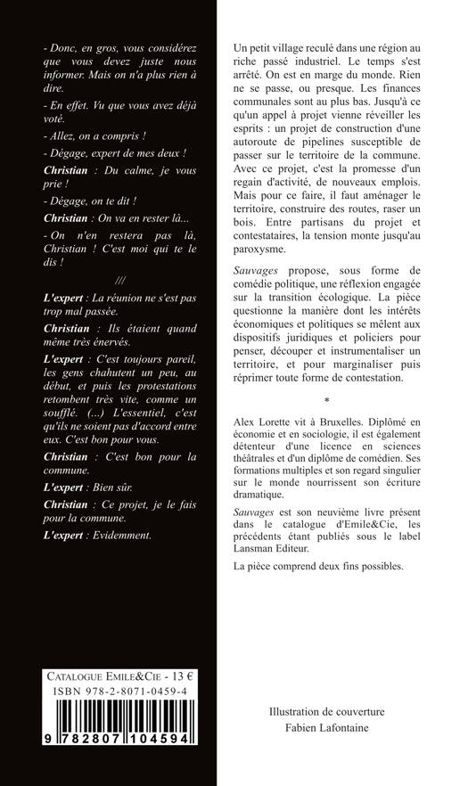 Un petit village reculé dans une région au riche passé industriel. Le temps s'est arrêté. On est en marge du monde. Rien ne se passe, ou presque. Les finances communales sont au plus bas. Jusqu'à ce qu'un appel à projet vienne réveiller les esprits : un projet de construction d'une autoroute de pipelines susceptible de passer sur le territoire de la commune. Avec ce projet, c'est la promesse d'un regain d'activité, de nouveaux emplois. Mais pour ce faire, il faut aménager le territoire, construire des routes, raser un bois. Entre partisans du projet et contestataires, la tension monte jusqu'au paroxysme. Sauvages propose, sous forme de comédie politique, une réflexion engagée sur la transition écologique. La pièce questionne la manière dont les intérêts économiques et politiques se mêlent aux dispositifs juridiques et policiers pour penser, découper et instrumentaliser un territoire, et pour marginaliser puis réprimer toute forme de contestation
