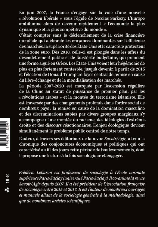 En 2007, la France s'engage dans une « révolution libérale » sous l'égide de Nicolas Sarkozy. L'Europe ambitionne alors de devenir rapidement « l'économie la plus dynamique et la plus compétitive du monde ». C'était compter sans le déclenchement de la crise financière. Dès 2010, la zone euro plongée dans les affres du désendettement public et de l'austérité budgétaire, qui prennent une forme aigüe en Grèce. Les États-Unis voient leur hégémonie de plus en plus fortement contestée, jusqu'à devenir, à partir de 2016 et de l'élection de Donald Trump, un foyer central de remise en cause du libre-échange et de la mondialisation des marchés. La période est marquée par la Chine, les « révolutions arabes » et le terrorisme islamiste. Des changements profonds bouleversent l'ordre social : la remise en cause de la domination masculine et des discriminations, montée du racisme, des idéologies d'extrême-droite et des discours réactionnaires. L'enjeu écologique devient le problème public central.