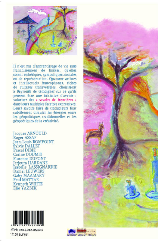 Il n'est pas d'apprentissage de vie sans franchissement de limites, qu'elles soient esthétiques, symboliques, sociales ou de représentation. Quatorze artistes et intellectuels francophones, riches de cultures transversales choisissent à Beyrouth de témoigner sur ce qu'ils pensent être une initiative d'avenir : valoriser des "savoirs de frontières" dans leurs multiples facettes expressives.(http://www.institut-charles-cros.eu/)