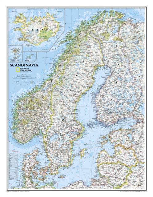National Geographic's wall map of Scandinavia is one of the largest and most detailed maps of the region. The signature Classic style design uses a bright, easy-to-read color palette. This map features thousands of place names, accurate political boundaries, national parks, and major infrastructure networks such as roads, superhighways, airports, canals, ferry routes, and high-speed and passenger railroads. The region's diverse terrain is detailed through accurate shaded relief, coastal bathymetry, and symbolism for water features and other land forms. Elevations of major peaks and depth soundings are expressed in meters. Inset maps provide detail of Iceland, the Faroe Islands, and Jan Mayen. In addition to Norway, Sweden, and Finland, coverage includes Denmark, Lithuania, Latvia, Estonia, and Kaliningrad Oblast.