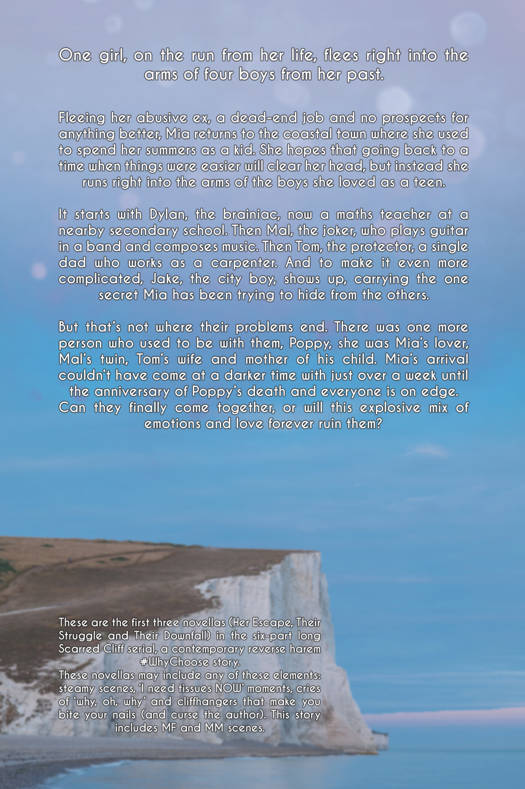 These are the first three novellas (Her Escape, Their Struggle and Their Downfall) in the six-part long Scarred Cliff serial, a contemporary reverse harem #WhyChoose story. These novellas may include any of these elements: steamy scenes, 'I need tissues NOW' moments, cries of 'why, oh, why' and cliffhangers that make you bite your nails (and curse the author). This story includes MF and MM scenes.