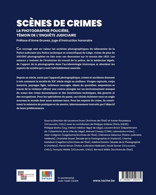 Sous la direction de Laurence Druez (Archives de l'État) et Xavier Rousseaux (UCLouvain, CHDJ) avec la contribution de Philippe Artières (Paris, EHESS), Philippe Boxho (ULg, Institut médico-légal de Liège), Laurent Brück (Département de l'Urbanisme de la Ville de Liège), Manuel Charpy (CNRS, Laboratoire InVisu), Alain Colignon (CegeSoma/Archives de l'État), Clémence Delacour (Police Judiciaire Fédérale), Charlotte Doyen (Musée de la Photographie à Charleroi), Chantal Kesteloot (CegeSoma/Archives de l'État), Adeline Rossion (Musée de la Photographie à Charleroi), Pierre Simon (Police Judiciaire Fédérale), David Somer (UCLouvain, CHDJ), François Welter (UCLouvain, CHDJ), Bernard Wilkin (Archives de l'État).