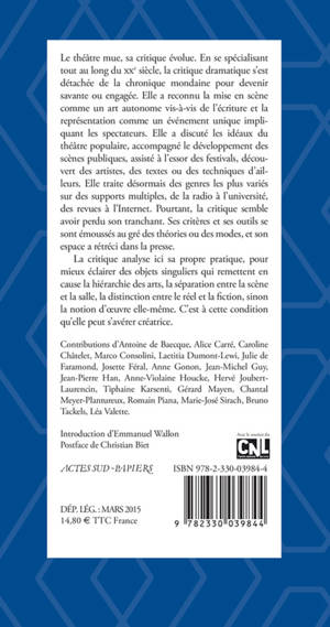 Le théâtre mue, sa critique évolue. En se spécialisant tout au long du xxe siècle, la critique dramatique s'est détachée de la chronique mondaine pour devenir savante ou engagée. Elle a reconnu la mise en scène comme un art autonome vis-à-vis de l'écriture et la représentation comme un événement unique impliquant les spectateurs. Elle a discuté les idéaux du théâtre populaire, accompagné le développement des scènes publiques, assisté à l'essor des festivals, découvert des artistes, des textes ou des techniques d'ailleurs. Elle traite désormais des genres les plus variés sur des supports multiples, de la radio à l'université, des revues à l'Internet. Pourtant, la critique semble avoir perdu son tranchant. Ses critères et ses outils se sont émoussés au gré des théories ou des modes, et son espace a rétréci dans la presse.