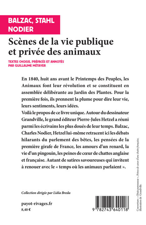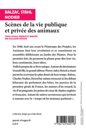 Voilà le propos de ce livre unique. Autour du dessinateur Grandville, le grand éditeur Pierre-Jules Hetzel a réuni parmi les écrivains les plus doués de leur temps. Balzac, Charles Nodier, Hetzel lui-même retracent ici les débats hilarants du parlement des bêtes, les pensées de la première girafe de France, les amours d'un renard, la vie d'un pingouin, les peines de coeur de chattes anglaises et françaises. Autant de satires savoureuses qui invitent à renouer avec le « temps où les animaux parlaient ».