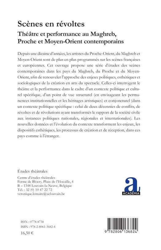 Depuis une dizaine d'années, les artistes du Proche-Orient, du Maghreb et Moyen-Orient sont de plus en plus programmés sur les scènes françaises et européennes. Cet ouvrage propose une série d'études des scènes contemporaines dans les pays du Maghreb, du Proche et du Moyen-Orient, afin de renouveler l'approche des enjeux politiques, esthétiques et sociologiques de la création en arts du spectacle.