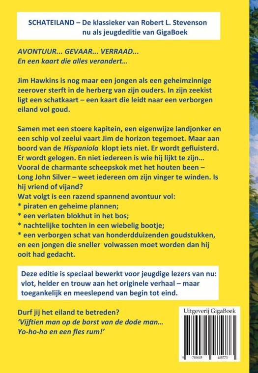 SCHATEILAND – De jeugdeditie van GigaBoek Avontuur. Gevaar. Verraad. En een kaart die alles verandert… Jim Hawkins is nog maar een jongen als een geheimzinnige zeerover sterft in de herberg van zijn ouders. In zijn zeekist ligt een schatkaart – een kaart die leidt naar een verborgen eiland vol goud. Samen met een stoere kapitein, een eigenwijze landjonker en een schip vol zeelui vaart Jim de horizon tegemoet. Maar aan boord van de Hispaniola klopt iets niet. Er wordt gefluisterd. Er wordt gelogen. En niet iedereen is wie hij lijkt te zijn… Vooral de charmante scheepskok met het houten been – Long John Silver – weet iedereen om zijn vinger te winden. Is hij vriend of vijand? Wat volgt is een razend spannend avontuur vol: - piraten en geheime plannen - een verlaten blokhut in het bos - nachtelijke tochten in een wiebelig bootje - een verborgen schat van honderdduizenden goudstukken. En een jongen die sneller moet volwassen worden dan hij ooit had gedacht. ________________________________________ Deze GigaBoek-jeugdeditie is speciaal bewerkt voor lezers van 10–15 jaar: vlot, helder en trouw aan het originele verhaal – maar toegankelijk en meeslepend van begin tot eind. Durf jij het eiland te betreden? ‘Vijftien man op de borst van de dode man… Yo-ho-ho en een fles rum!’