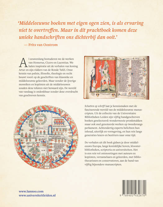 Schatten op schrift laat je kennismaken met de fascinerende wereld van de middeleeuwse manuscripten. Uit de collectie van de Universitaire Bibliotheken Leiden zijn vijftig handgeschreven boeken geselecteerd: wondermooie pronkstukken maar ook snel genoteerde werken op tweederangs perkament. Achtendertig experts belichten hun inhoud, uiterlijk en vormgeving, en hun reis langs generaties lezers en bezitters naar onze tijd.