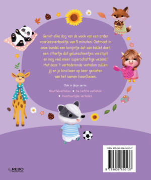 Geniet elke dag van de week van een ander voorleesverhaaltje van 5 minuten. Ontmoet in deze bundel een konijntje dat aan ballet doet, een ottertje dat gelukssteentjes verstopt en nog veel meer superschattige wezens! Met deze 7 vertederende verhalen zullen jij en je kind keer op keer genieten van het samen (voor)lezen.