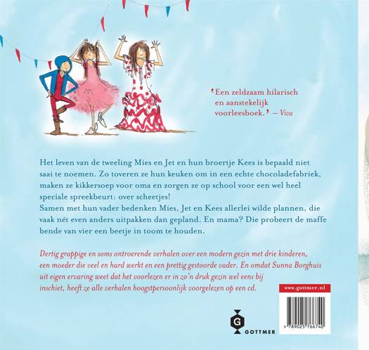 'Scheetjesles en andere voorleesverhalen over de bende van vier' is een lekker dikke voorleesbundel met 30 heerlijke verhalen voor kinderen vanaf 5 jaar. Het leven van de tweeling Mies en Jet en hun broertje Kees is bepaald niet saai te noemen. Zo toveren ze hun keuken om in een echte chocoladefabriek, maken ze kikkersoep voor oma en zorgen ze op school voor een wel heel speciale spreekbeurt: over scheetjes!Samen met hun vader bedenken Mies, Jet en Kees allerlei wilde plannen, die vaak nét even anders uitpakken dan gepland. En mama? Die probeert de maffe bende van vier een beetje in toom te houden. Sunna Borghuis is bekend van haar boeken over vieze Lies en dikke Vik, waarvoor ze onder andere de Hotze de Roosprijs won. 'Scheetjesles en andere voorleesverhalen over de bende van vier' is bedoeld voor iets jongere kinderen, maar sprankelt net zo als haar andere werk.