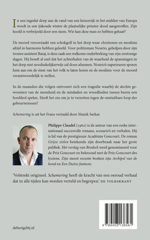Schemering is de grote nieuwe roman van meesterverteller Philippe Claudel in de geest van Het verslag van Brodeck en Grijze zielen