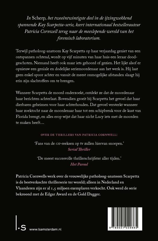 Patricia Cornwells werk over de vrouwelijke patholoog-anatoom Scarpetta is de bestverkochte thrillerserie ter wereld; alleen in Nederland en Vlaanderen zijn er al 1,5 miljoen exemplaren verkocht. Ook werd de serie bekroond met de Edgar Award en de Gold Dagger.