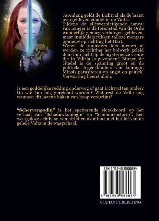“Schervengodin” is het spetterende slotakkoord op het verhaal van “Schaduwkoningin” en “Schimmenstorm”. Een weergaloze achtbaan van strijd en avontuur met het lot van de gehele Valta in de waagschaal.