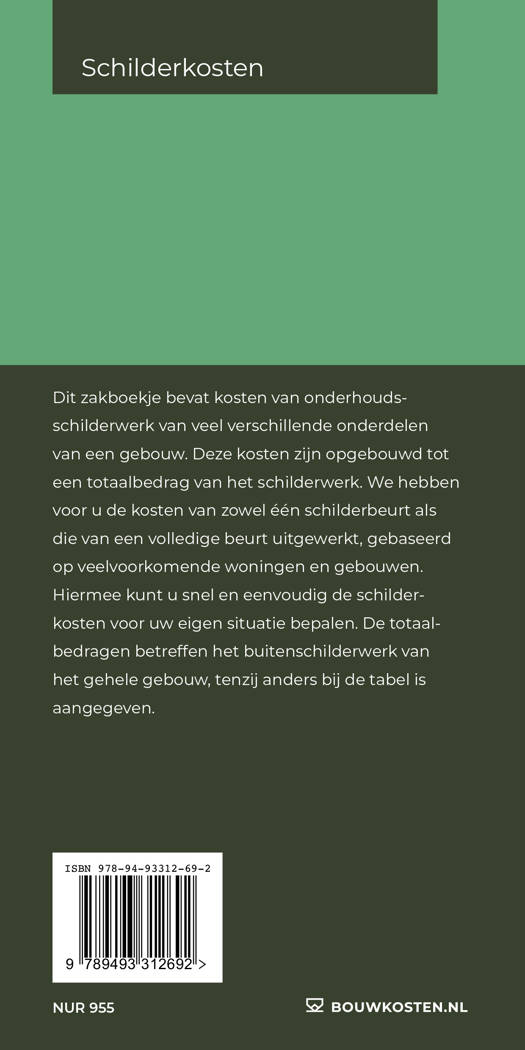 Dit zakboekje bevat kosten van onderhoudsschilderwerk van veel verschillende onderdelen van een gebouw. Deze kosten zijn opgebouwd tot een totaalbedrag van het schilderwerk. We hebben voor u de kosten van zowel één schilderbeurt als die van een volledige beurt uitgewerkt, gebaseerd op veel-voorkomende woningen en gebouwen. Hiermee kunt u snel en eenvoudig de schilderkosten voor uw eigen situatie bepalen. De totaalbedragen betreffen het buitenschilderwerk van het gehele gebouw, tenzij anders bij de tabel is aangegeven.