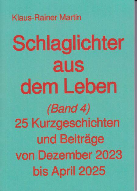 In meinem bisherigen Leben hatte ich viele Erlebnisse, über welche ich berichten wollte. Dabei liegt es mir nicht so sehr, diese Erlebnisse so auszuschmücken und ausführlich zu beschreiben, dass aus ihnen ein Roman wird. Ich bevorzuge es, daraus jeweils eine Kurzgeschichte zu machen und als eBook zu veröffentlichen.. Um alle Kurzgeschichten aber auch denen zugänglich zu machen, die keine eBooks dort lesen, sondern lieber ein Buch in der Hand halten, habe ich mich im April 2021 dazu entschlossen, 25 Kurzgeschichten in einem ersten Sammelband, im Juni 2021 weitere 25 Kurzgeschichten in einem zweiten Sammelband, im Februar 2024 weitere 25 Kurzgeschichten in einem dritten Sammelband und nun 25 weitere Kurzgeschichten und Beiträge in einem vierten Sammelband zu veröffentlichen.