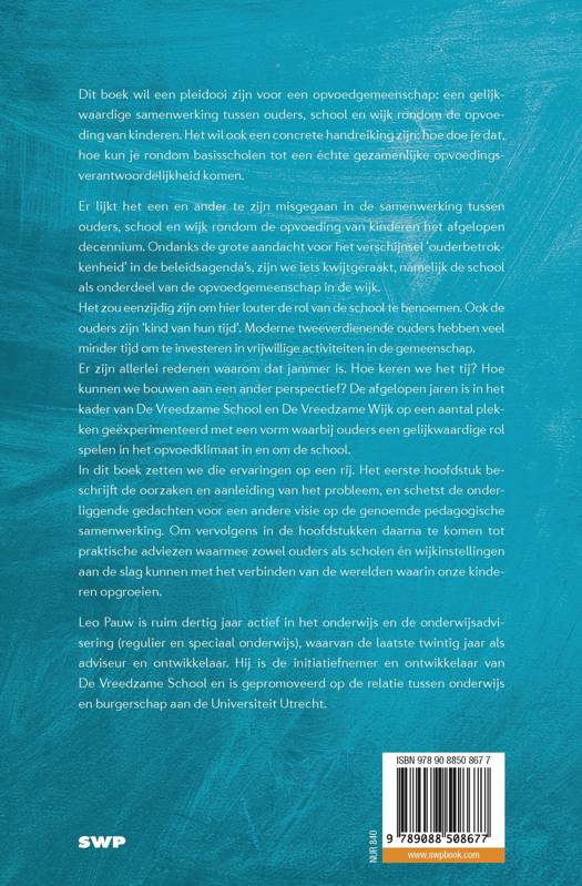 Dit boek wil een pleidooi zijn voor een opvoedgemeenschap: een gelijkwaardige samenwerking tussen ouders, school en wijk rondom de opvoeding van kinderen. Het wil ook een concrete handreiking zijn dat een antwoord geeft op de vraag hoe we rondom basisscholen kunnen komen tot een échte gezamenlijke opvoedingsverantwoordelijkheid.