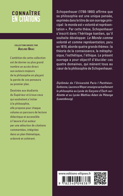 Schopenhauer (1788-1860) affirme que sa philosophie est une unique pensée, exprimée dans le titre de l’ouvrage principal : le monde est « volonté et représentation ». Par cette thèse, Schopenhauer s’inscrit dans l’héritage kantien, qu’il souhaite développer. Le Monde comme volonté et comme représentation, paru en 1819, aborde quatre grands thèmes : la théorie de la connaissance, la métaphysique, l’esthétique, l’éthique. Le présent ouvrage a pour objectif d’élucider ces quatre domaines, qui mènent tous au cœur de la philosophie de Schopenhauer.