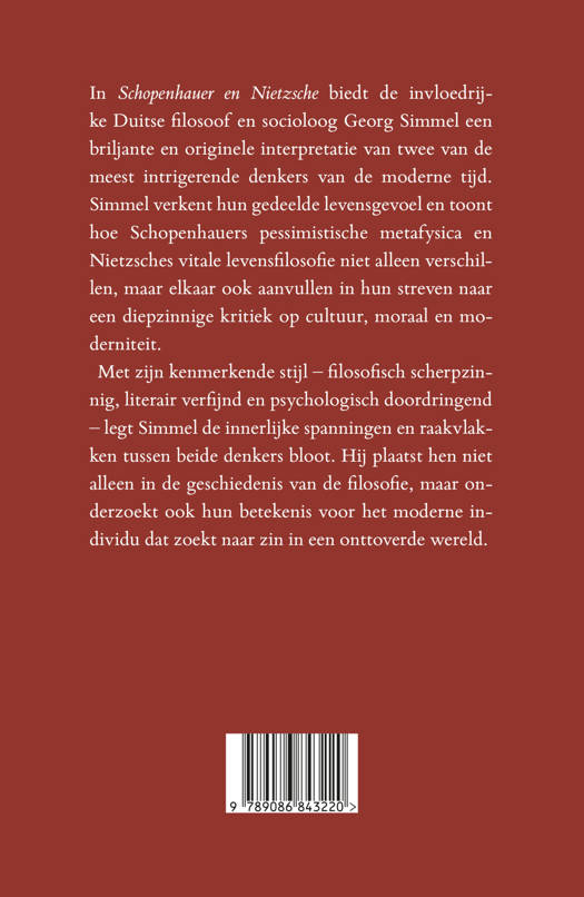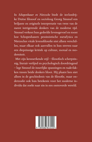 In Schopenhauer en Nietzsche biedt de invloedrijke Duitse filosoof en socioloog Georg Simmel een briljante en originele interpretatie van twee van de meest intrigerende denkers van de moderne tijd. Simmel verkent hun gedeelde levensgevoel en toont hoe Schopenhauers pessimistische metafysica en Nietzsches vitale levensfilosofie niet alleen verschillen, maar elkaar ook aanvullen in hun streven naar een diepzinnige kritiek op cultuur, moraal en moderniteit. Met zijn kenmerkende stijl – filosofisch scherpzinnig, literair verfijnd en psychologisch doordringend – legt Simmel de innerlijke spanningen en raakvlakken tussen beide denkers bloot. Hij plaatst hen niet alleen in de geschiedenis van de filosofie, maar onderzoekt ook hun betekenis voor het moderne individu dat zoekt naar zin in een onttoverde wereld.