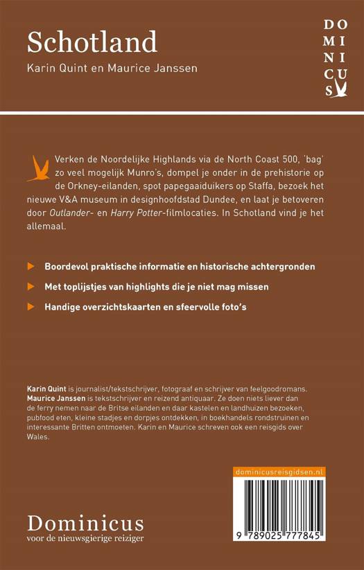 Ontdek Schotland op vakantie met deze Dominicus-reisgids en trek de woeste en ongerepte Schotse hooglanden in, verken de prachtige natuur van de eilanden aan de noord- en westkust of ga op stedentrip naar Glasgow, de grootste stad van Schotland, of bezoek Edinburgh - een sprookjesachtig oord met internationale allure. In deze reisgids vind je de mooiste wandeltochten om de natuurgebieden te ontdekken waarom Schotland bekendstaat. Ontdek de mooiste kastelen en historische plaatsjes, bezoek prachtige kathedralen en kerken en maak kennis met de hartelijke bevolking. Beleef de ultieme vakantie in Schotland, een land dat zowel per auto als vliegtuig bereikbaar is vanuit Nederland of België. Deze reisgids staat boordevol praktische informatie, historische achtergronden, handige overzichtskaarten, sfeervolle foto's en uitgebreide culturele achtergrondinformatie, is altijd up-to-date en geschreven door Nederlandstalige experts.