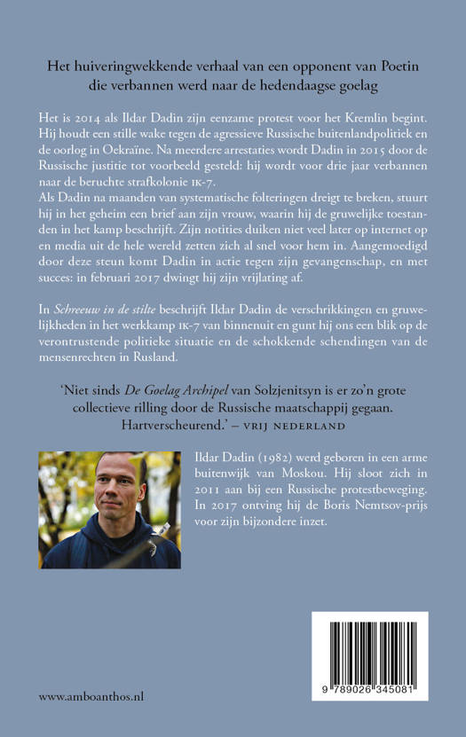 Ildar Dadin – Schreeuw in de stilte In Schreeuw in de stilte beschrijft Ildar Dadin de verschrikkingen en de gruwelijkheden in het werkkamp IK-7 van binnenuit, en gunt hij ons een blik op de verontrustende politieke situatie in Rusland en de schokkende schendingen van de mensenrechten. Het is 2014 als Ildar Dadin zijn eenzame protest voor het Kremlin begint. Hij houdt een stille wake tegen agressieve Russische buitenlandpolitiek en de oorlog in Oekraïne. Na meerdere arrestaties wordt Dadin in 2015 de Russische justitie tot voorbeeld gesteld: hij wordt voor drie jaar verbannen naar de beruchte strafkolonie IK-7. Als Dadin na maanden van systematische folteringen dreigt te breken, stuurt hij in het geheim een brief aan zijn vrouw, waarin hij de gruwelijke toestanden in het kamp beschrijft. Zijn notities duiken niet veel later op internet op en media uit de hele wereld zetten zich al snel voor hem in. Aangemoedigd door deze steun, komt hij in actie tegen zijn gevangenschap, en met succes: in februari 2017 dwingt Dadin zijn vrijlating af. Schreeuw in de stilte is het huiveringwekkende verhaal van een opponent van Poetin die verbannen werd naar de hedendaagse goelag. Een must-read voor de lezers van Vlucht uit kamp 14 van Blaine Harden.