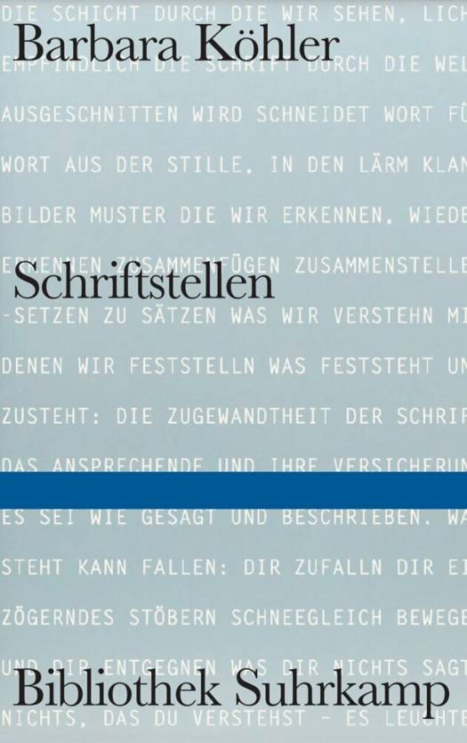 Der Band SCHRIFTSTELLEN versammelt erstmals Poetisches aus Barbara Köhlers Haupt- und Nebenwerken - von Deutsches Roulette (1991) über Niemands Frau (2007) bis 42 Ansichten zu Warten auf den Fluss (2017), von Texten aus der DDR-Künstlerzeitschrift Anschlag (1985) bis zu letzten Veröffentlichungen in die horen (2020). Ebenso enthalten sind Schriftinstallationen, die den multimedialen Charakter ihres Werkes dokumentieren. Bislang Unveröffentlichtes aus dem Nachlass beschließt diesen Band.