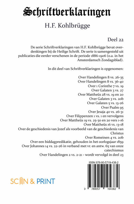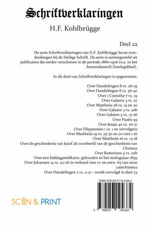 De serie Schriftverklaringen van H.F. Kohlbrügge bevat overdenkingen bij de Heilige Schrift. De serie is samengesteld uit publicaties die eerder verschenen in de periode 1886-1906 (o.a. in het Amsterdamsch Zondagsblad).