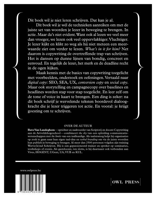 Dit boek wil je niet leren schrijven. Dat kan je al. Dit boek wil je wél de technieken aanreiken om met de juiste set van woorden je lezer in beweging te brengen. In actie. Maar da’s niet evident. Want ook al lezen we veel meer dan vroeger, we lezen ook veel oppervlakkiger. Vluchtiger. Je lezer kijkt en klikt zo weg als hij niet meteen een meerwaarde ziet om verder te lezen. What’s in it for him? Net daarom is copywriting de overtreffende trap van schrijven. Het is dansen op dunne lijnen van bondig, concreet en eenvoud. En tegelijk de lezer, het merk en de deadline recht in de ogen kijken.