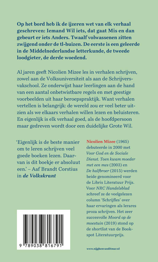 Al jaren geeft Nicolien Mizee les in verhalen schrijven, zowel aan de Volksuniversiteit als aan de Schrijversvakschool. Ze onderwijst haar leerlingen aan de hand van een aantal onbetwistbare regels en met geestige voorbeelden uit haar beroepspraktijk. Want verhalen vertellen is belangrijk: de wereld zou er veel beter uitzien als we elkaars verhalen willen lezen en beluisteren. En eigenlijk is elk verhaal goed, als de hoofdpersoon maar gedreven wordt door een duidelijke Grote Wil.
